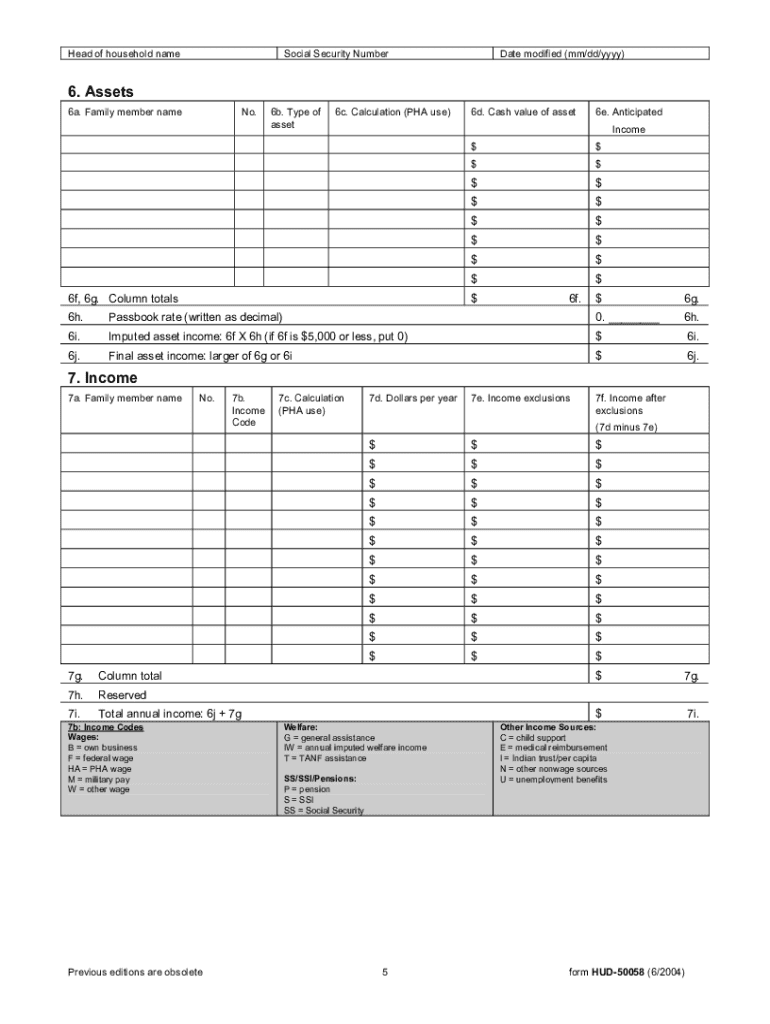 Head of household nameSocial Security NumberDate modified (mm/dd/yyyy)6. Assets No.6a. Family member name6b. Type of asset6c. Calculation (PHA use)6d. Cash value of asset6e. Anticipated Income6f,