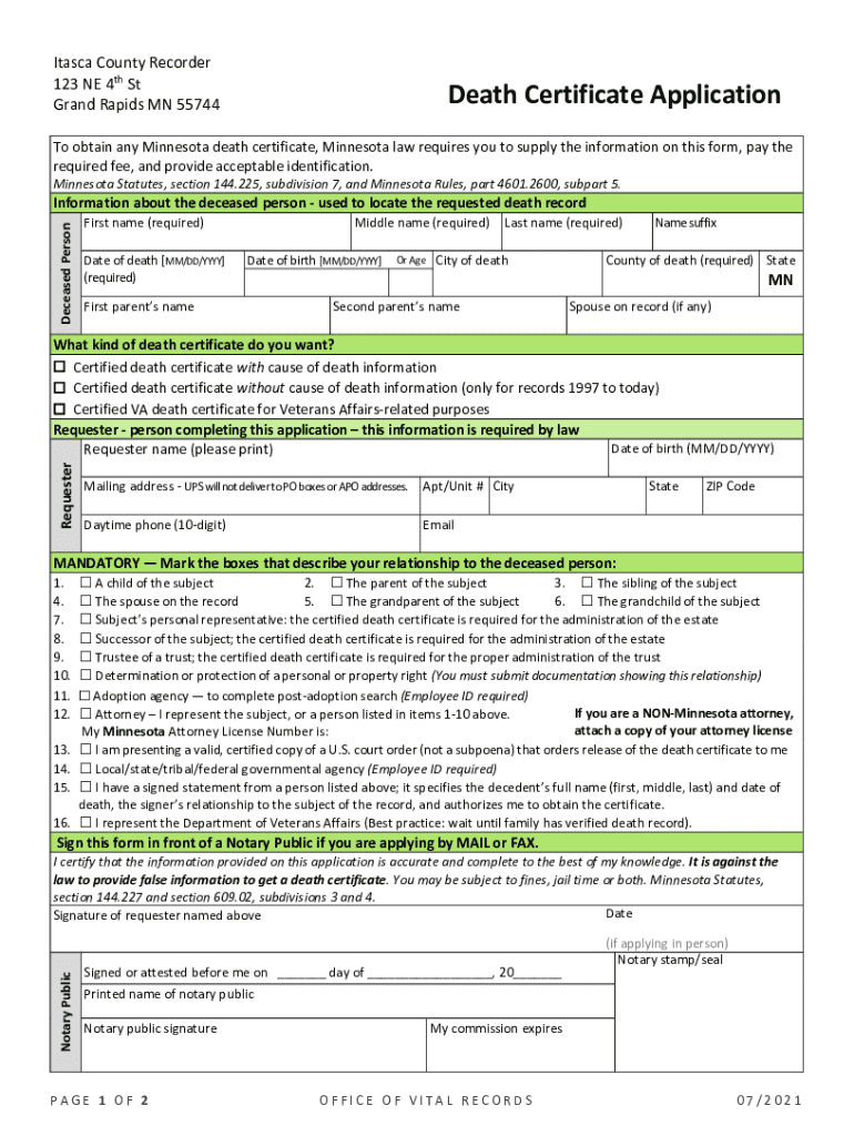 Get the free Minnesota Death Certificate Application