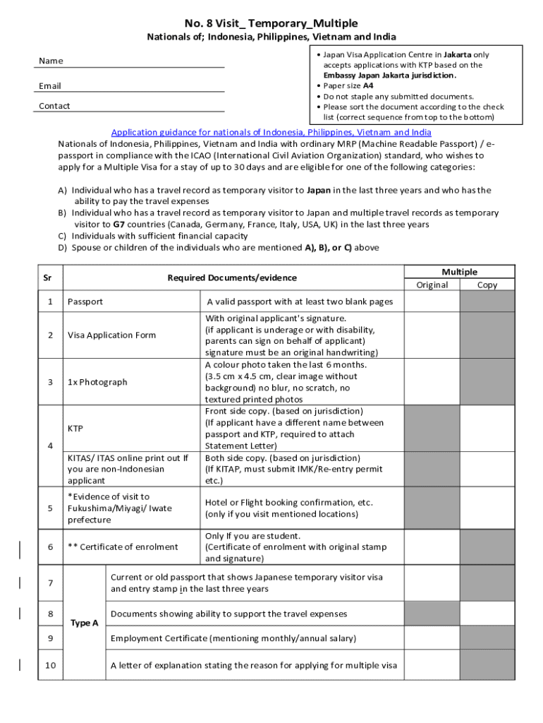 Eligibility for the Japan Multiple Visa Application Form is determined by specific criteria, including nationality and travel intentions. Applicants must belong to one of the eligible countries, specifically Indonesia, Philippines, Vietnam, or India. Additionally, the form permits dependents or accompanying family members to apply alongside the main applicant, depending on the travel arrangements.