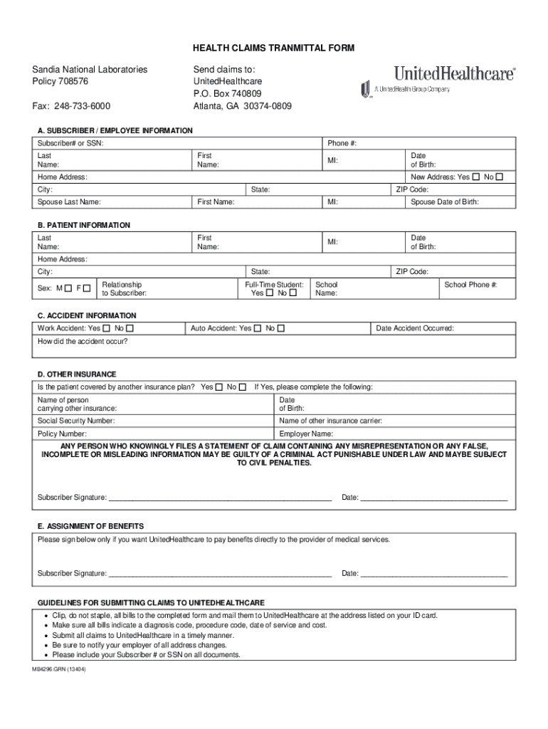 HEALTH CLAIMS TRANMITTAL FORM Sandia National Laboratories Policy 708576Send claims to: UnitedHealthcare P.O. Box 740809 Atlanta, GA 303740809Fax: 2487336000 A. SUBSCRIBER / EMPLOYEE INFORMATION Subscriber#