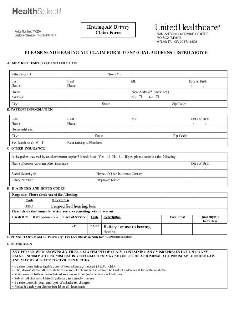 Policy Number: 744260 Customer Service # 18663369371SAN ANTONIO SERVICE CENTER PO BOX 740809 ATLANTA , GA 303740809PLEASE SEND HEARING AID CLAIM FORM TO SPECIAL ADDRESS LISTED ABOVE A. MEMBER / EMPLOYEE