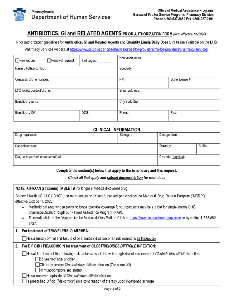 The Pennsylvania Antibiotics Prior Authorization Form is designed for healthcare providers to request authorization for antibiotic treatments and gastrointestinal (GI) agents. This form is essential due to the necessity for prior authorization in healthcare, ensuring that patients receive the medically appropriate treatments covered by their insurance. The form specifically addresses antibiotics and GI agents, presenting a streamlined process for providers to access necessary medications.