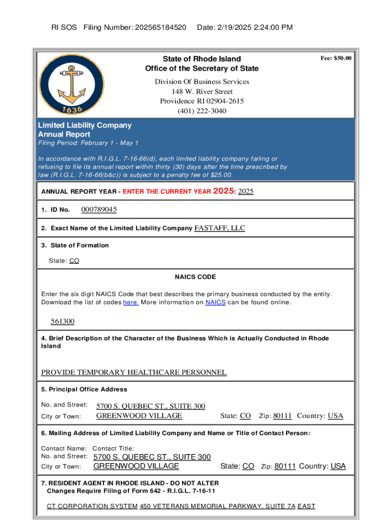 The Rhode Island LLC Annual Report must be filed annually between February 1 and May 1. Missing this deadline may result in penalties.
