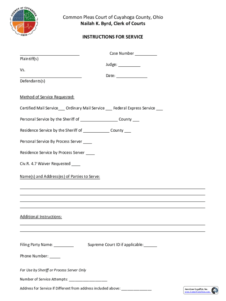 The audience for the Cuyahoga County Service Instructions includes legal professionals such as attorneys, as well as plaintiffs and defendants involved in court cases. Anyone participating in legal actions within Cuyahoga County should be knowledgeable about this form.