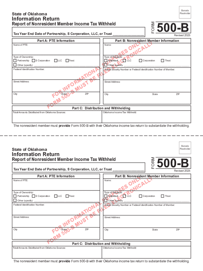 The Oklahoma Form 500-B is required for nonresident members of pass-through entities, such as partnerships and S Corporations, to report income tax withheld. It is also necessary for those receiving distributions from trusts or LLCs.