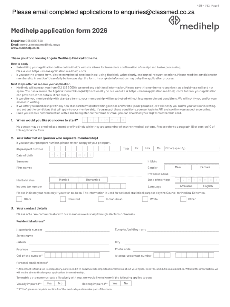 Completing this form accurately ensures a smooth application process and facilitates your access to necessary healthcare services. By registering through the Medihelp application form 2026, you take a significant step towards securing comprehensive health coverage.
