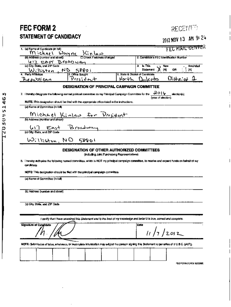RECEiVEOFEC FORM 2 STATEIVIENT OF CANDIDACY2012 NOV 13 ftMS^ZW1. (a) Name of Candidate (in full) (b) Address (number and street) Check if address changed2. Candidate\'s FEC Identification Number(c)