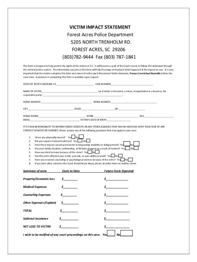 Any victim of a crime in South Carolina may submit a Victim Impact Statement to express the emotional and financial effects of the crime on their life.