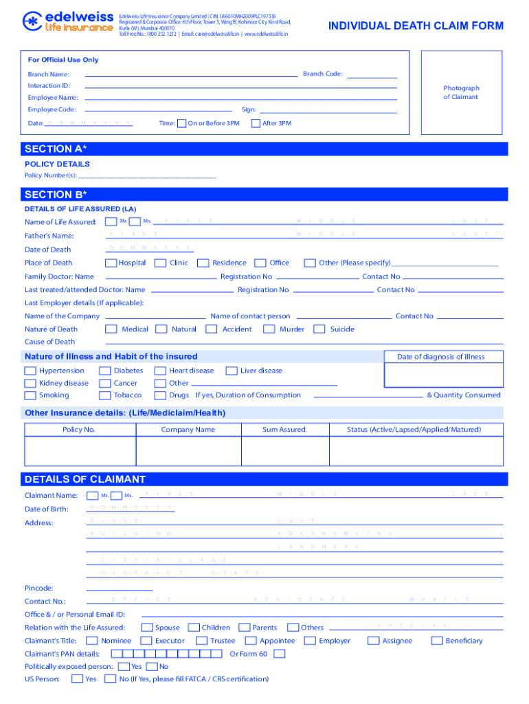 This form can be used by policyholders and their beneficiaries who need to file a death claim with Edelweiss Life Insurance Company.