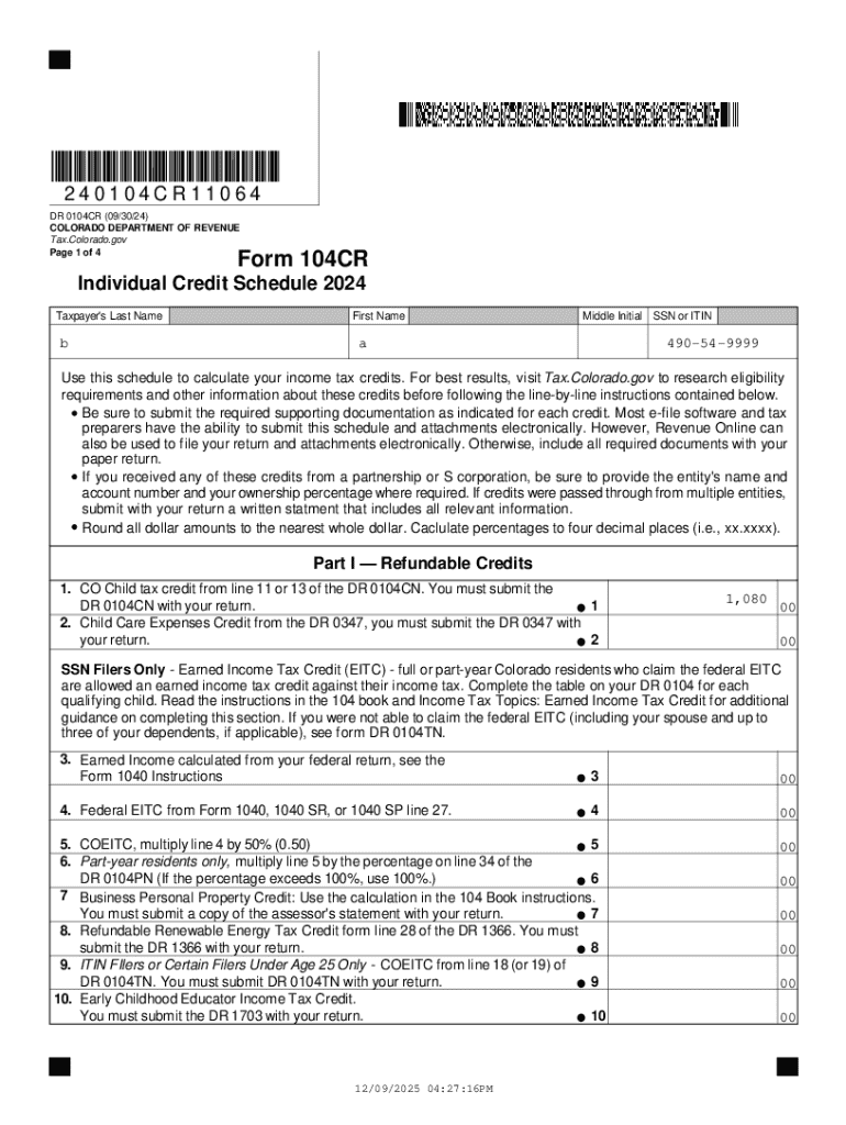 The Colorado Individual Credit Schedule is essential for taxpayers aiming to calculate and claim state tax credits accurately. This form, known as the DR 0104CR, plays a pivotal role in determining credit eligibility and potential tax savings for individuals filing their income tax returns in Colorado. It encompasses various credit types, including refundable credits and credits for taxes paid to other states, benefiting Colorado residents during their annual tax filing process.