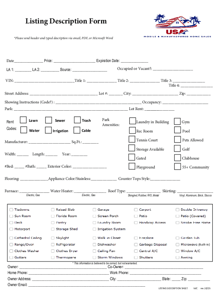 Listing Description Form *Please send header and typed description via email, PDF, or Microsoft WordDate___ Price: ___ Expiration Date: ___ LA 1: ___ LA 2: ___ Source: ___Occupied or Vacant?: ___VIN: