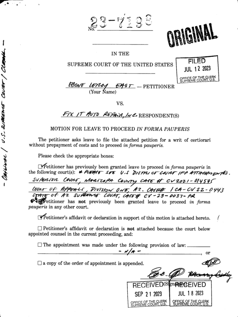 The motion for leave to proceed in forma pauperis is a crucial legal request allowing individuals to file a petition in the U.S. Supreme Court without the burden of prepaying court fees. This motion is significant as it promotes access to justice for those unable to afford the associated costs. It serves as a lifeline for petitioners who face financial difficulties and seek legal recourse.