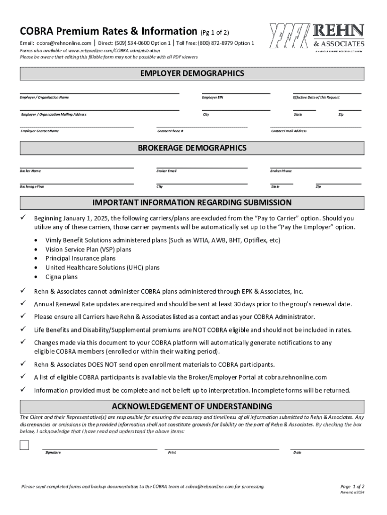 The COBRA Premium Rates & Information Form is a crucial document used by employers and brokers to submit COBRA premium rates and plan details for administration purposes.