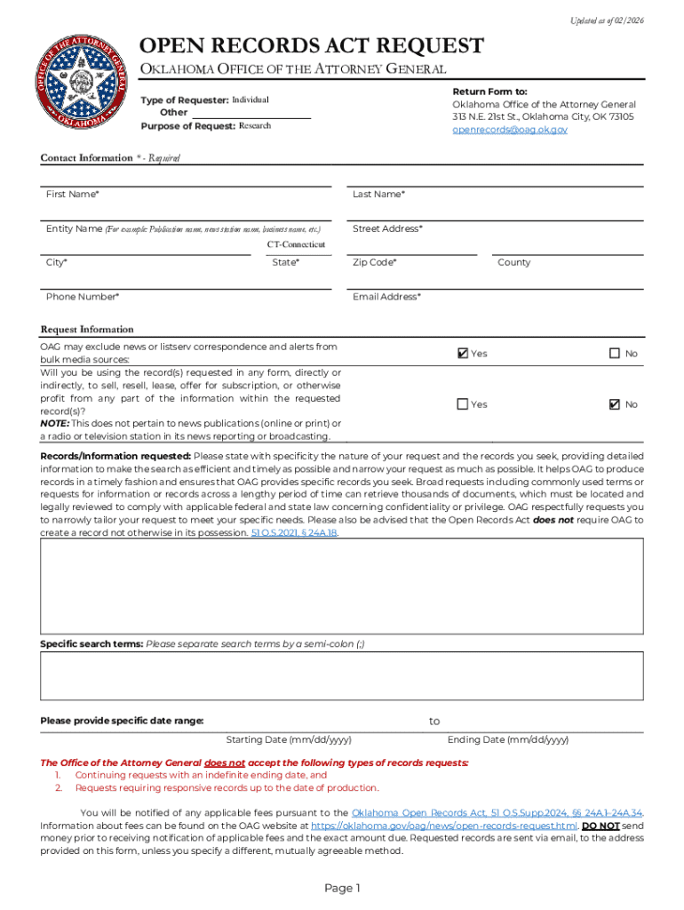 Get the free Oklahoma Open Records Act Request Form