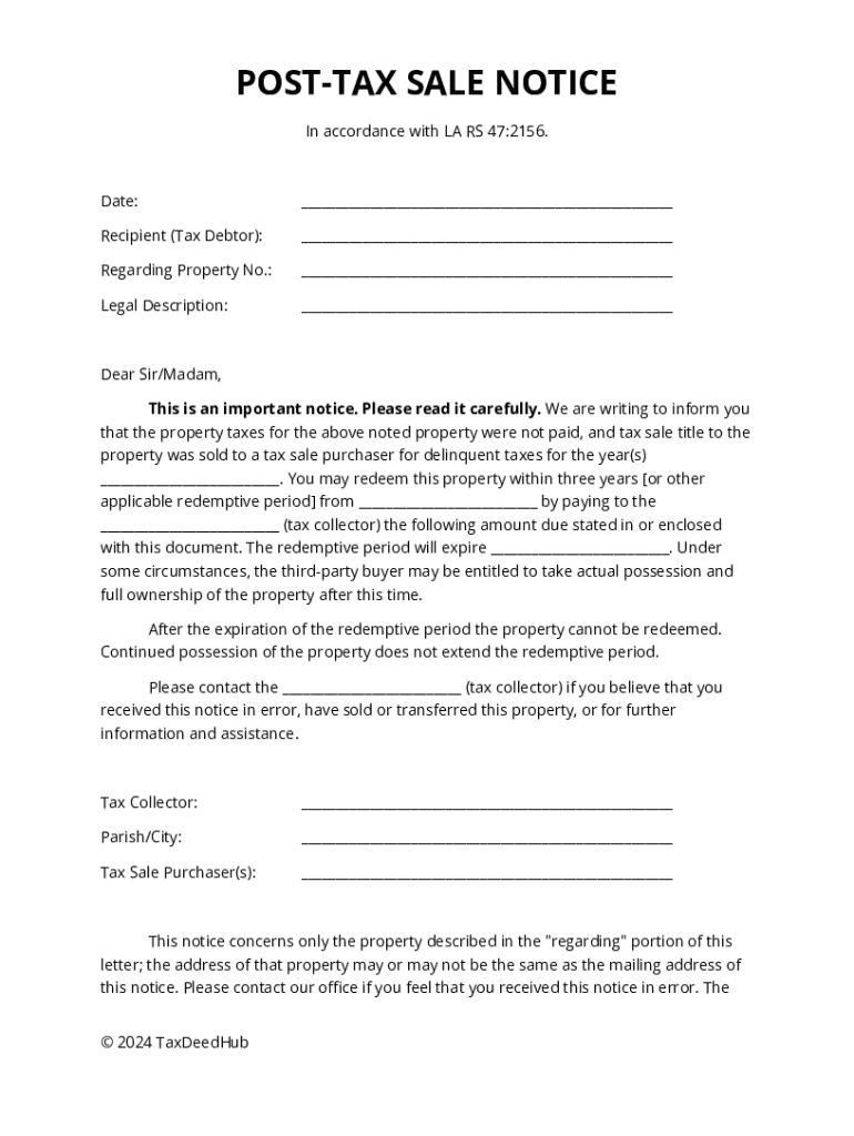 The Post-Tax Sale Notice is a legal document used by tax collectors in Louisiana to inform property owners about the sale of their property due to unpaid taxes.