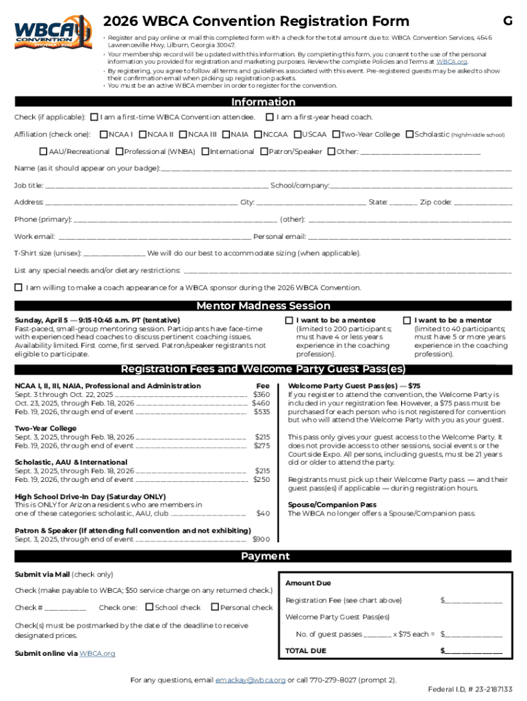 The WBCA Convention Registration Form serves as a vital tool for individuals intending to register for the 2026 WBCA Convention. This form collects essential personal information from attendees, which is crucial for processing their registration effectively. The submission of the form requires the payment of associated fees, which helps ensure a smooth experience for both registrants and the organizing body.
