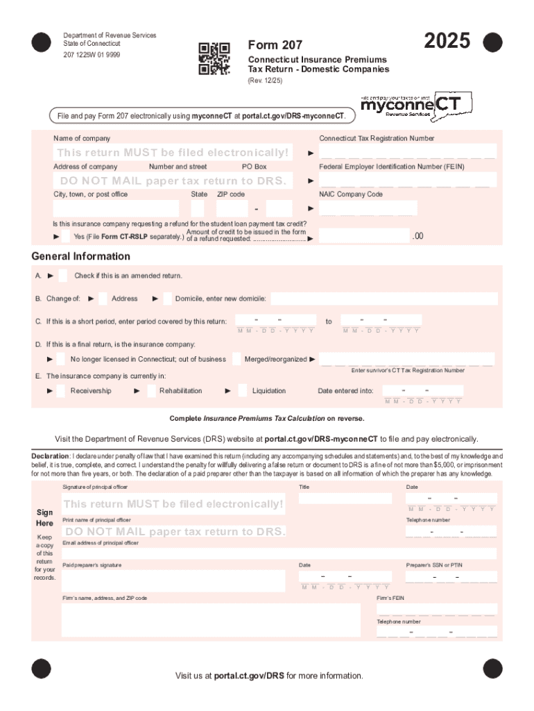 Domestic insurance companies conducting business in Connecticut are required to file Form 207 to fulfill their insurance premiums tax obligations for the year.