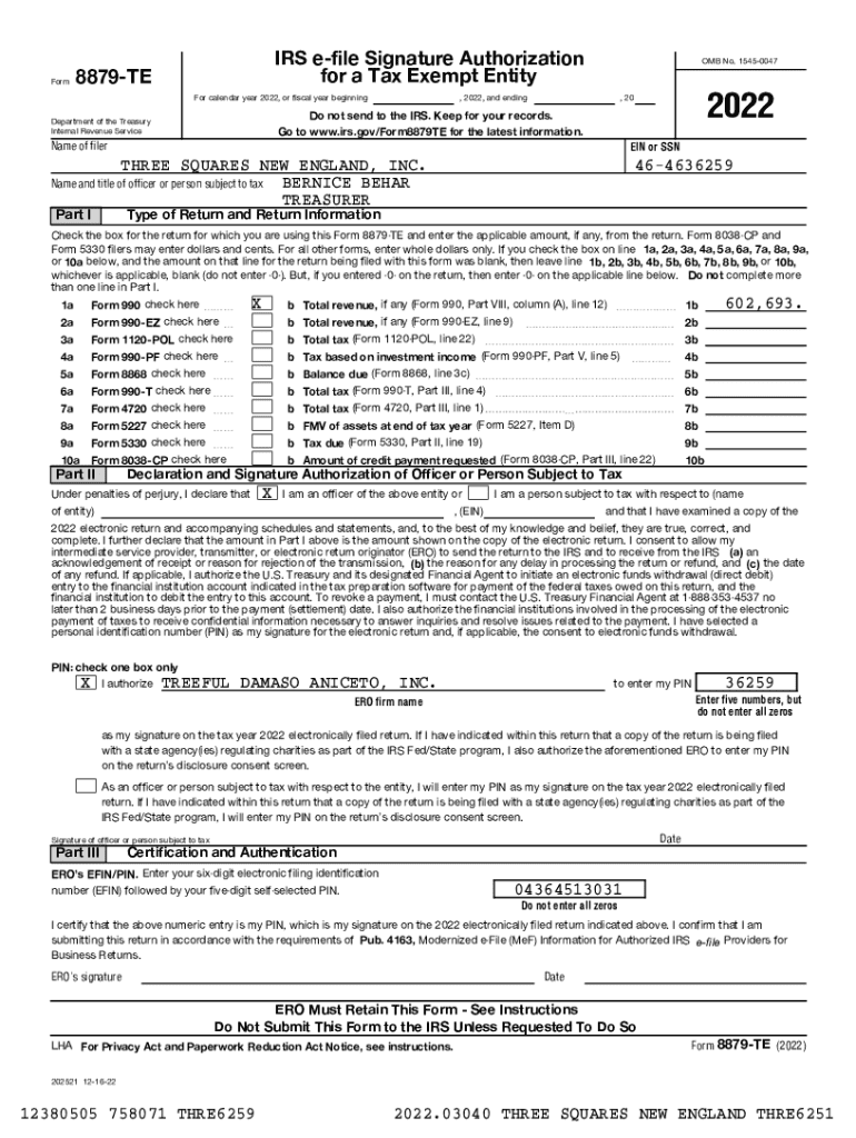 IRS Form 8879-TE is a crucial document that enables tax-exempt entities to authorize electronic returns to the IRS. This tax exempt entity form streamlines the process of filing, ensuring compliance with federal regulations.