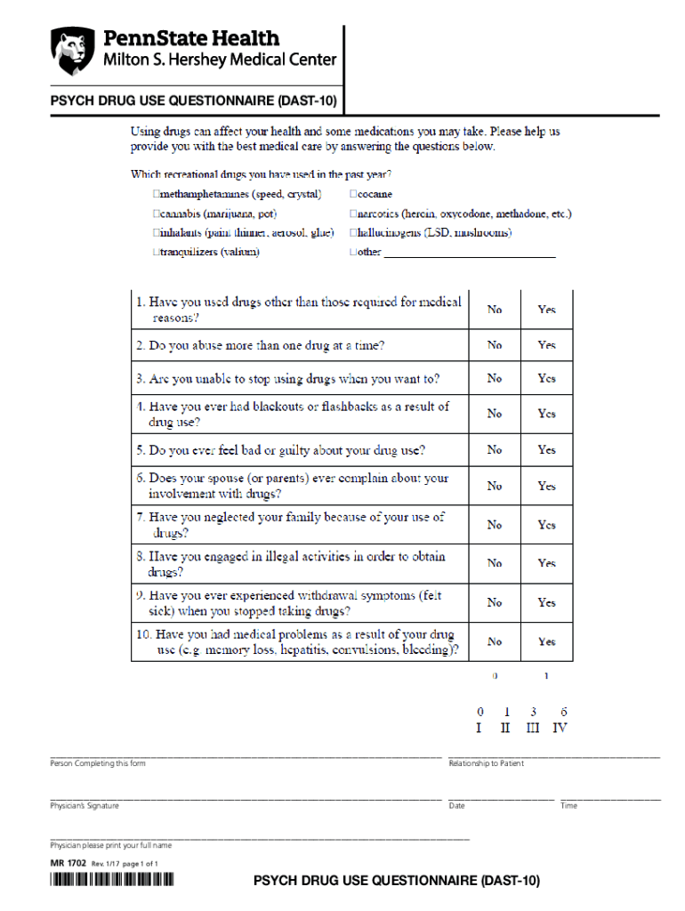 The Psych Drug Use Questionnaire (DAST-10) is a medical history form used by physicians to assess patients' drug use and history.