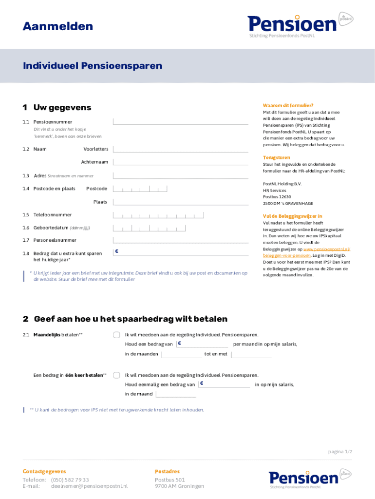 Het aanmeldingsformulier voor Individueel Pensioensparen (IPS) is een essentieel document voor werknemers bij Stichting Pensioenfonds PostNL. Dit formulier stelt deelnemers in staat zich aan te melden voor het pensioenprogramma en biedt belangrijke informatie over hun toekomstige financiële planning. Het doel van dit formulier is om werknemers te helpen bij het plannen van hun pensioen en deze structuur te vereenvoudigen.
