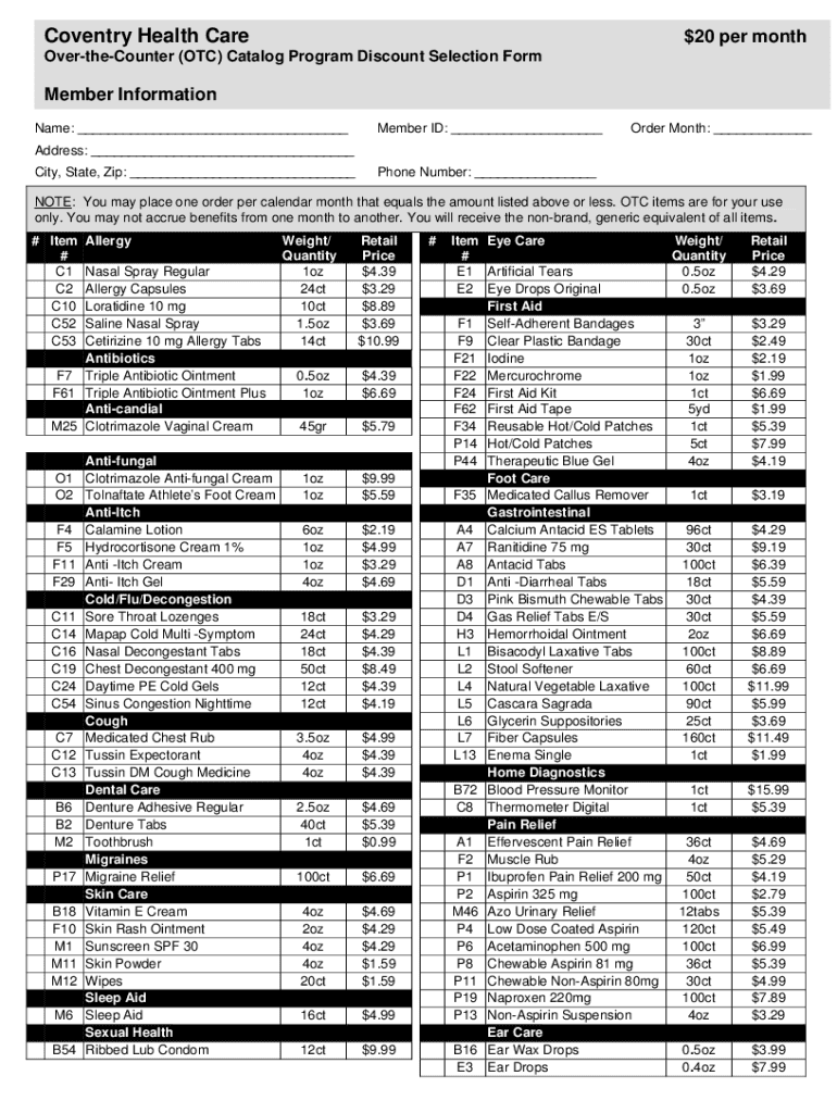 The Coventry Health Care OTC Catalog Program Discount Selection Form is a crucial document that enables members to order over-the-counter (OTC) health items efficiently. This form is designed to streamline the ordering process for users, allowing them to select necessary products from a catalog specific to Coventry Health Care. By using this form, members can take advantage of health benefits tailored to their needs.