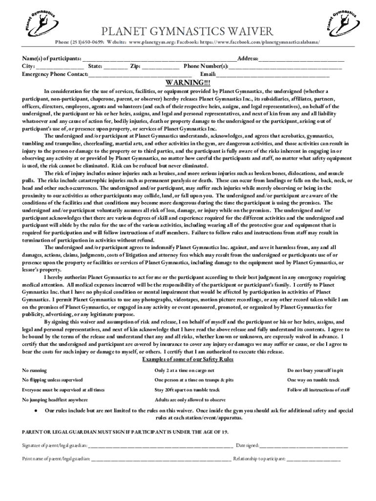 The Planet Gymnastics Waiver must be signed by a parent or legal guardian of any participant under the age of 19. This ensures that the responsible adult acknowledges the risks associated with gymnastics activities.