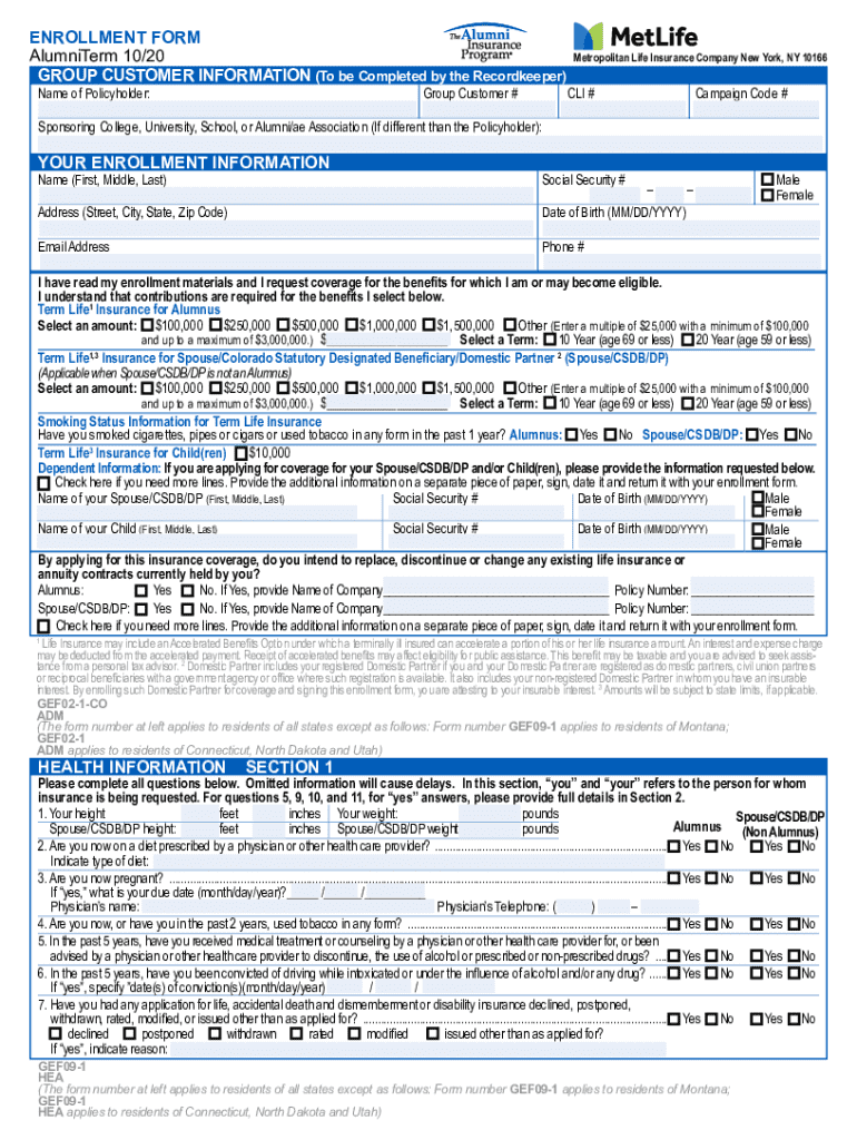 ENROLLMENT FORM AlumniTerm 10/20 Metropolitan Life Insurance Company New York, NY 10166 GROUP CUSTOMER INFORMATION (To be Completed by the Recordkeeper) Name of Policyholder:Group Customer #CLI #Campaign