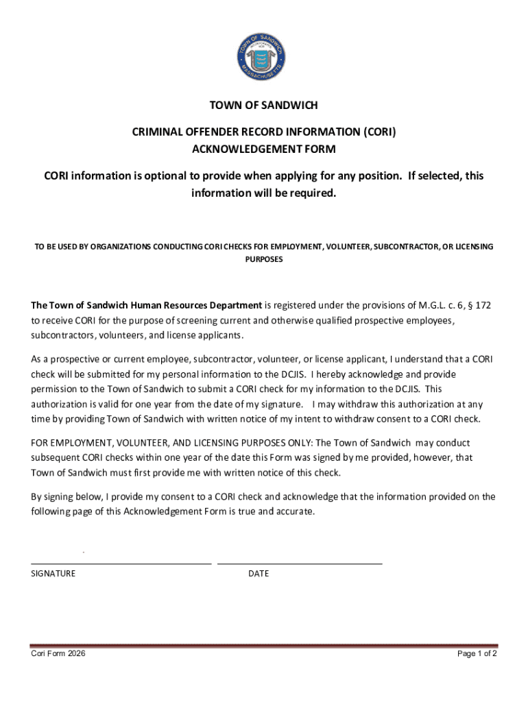 The Criminal Offender Record Information (CORI) Acknowledgement Form is a legal document used by the Town of Sandwich, Massachusetts, to obtain consent from applicants for a criminal record check.