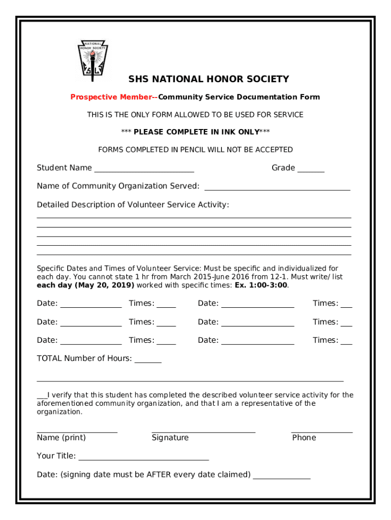 SHS NATIONAL HONOR SOCIETYProspective MemberCommunity Service Documentation Form THIS IS THE ONLY FORM ALLOWED TO BE USED FOR SERVICE *** PLEASE COMPLETE IN INK ONLY*** FORMS COMPLETED IN PENCIL WILL