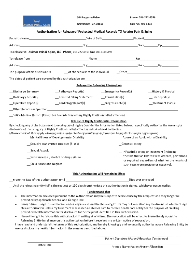 The Authorization for Release of Protected Medical Records is a medical records release form used by patients in Georgia to authorize the release of their health information to Aviator Pain & Spine, LLC.