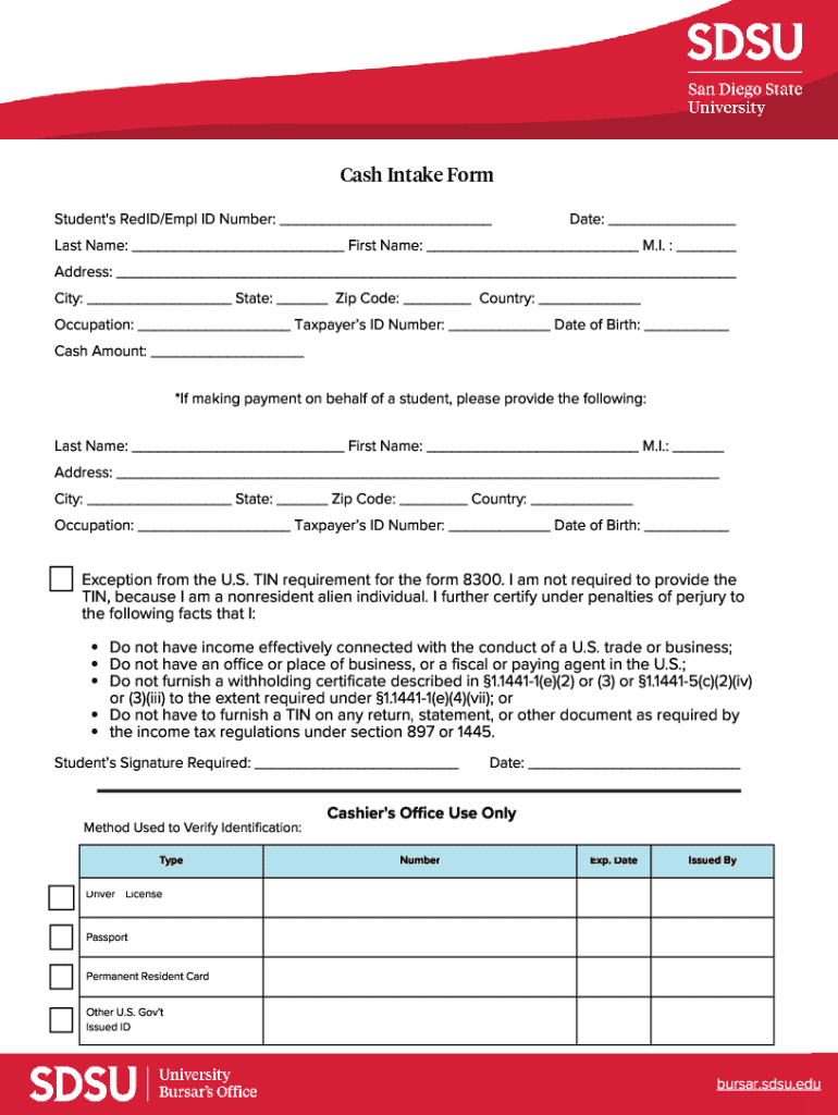 The Student Cash Intake Form is designed for students at SDSU and authorized individuals making payments on their behalf, including guardians and sponsors.