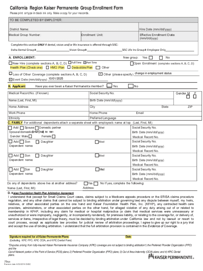 Get the free California Kaiser Permanente Group Enrollment Form