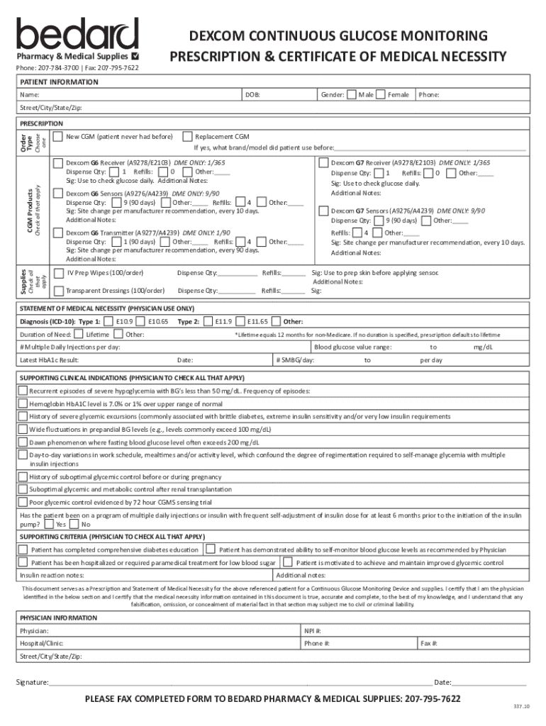 DEXCOM CONTINUOUS GLUCOSE MONITORING PRESCRIPTION & CERTIFICATE OF MEDICAL NECESSITYPharmacy & Medical Supplies Phone: 2077843700 | Fax: 2077957622PATIENT INFORMATION Name:DOB:Gender:MaleFemalePhone:Street/City/State/Zip:Check