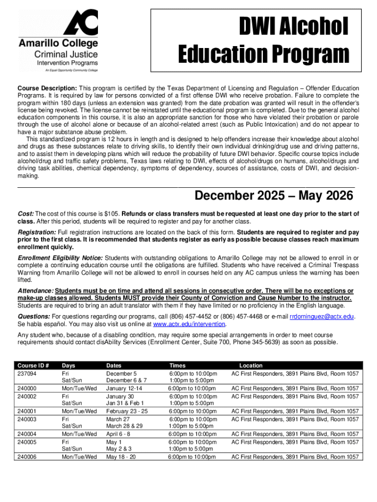 This form is intended for individuals who have been convicted of a first offense DWI and are required to complete an alcohol education program as part of their probation.