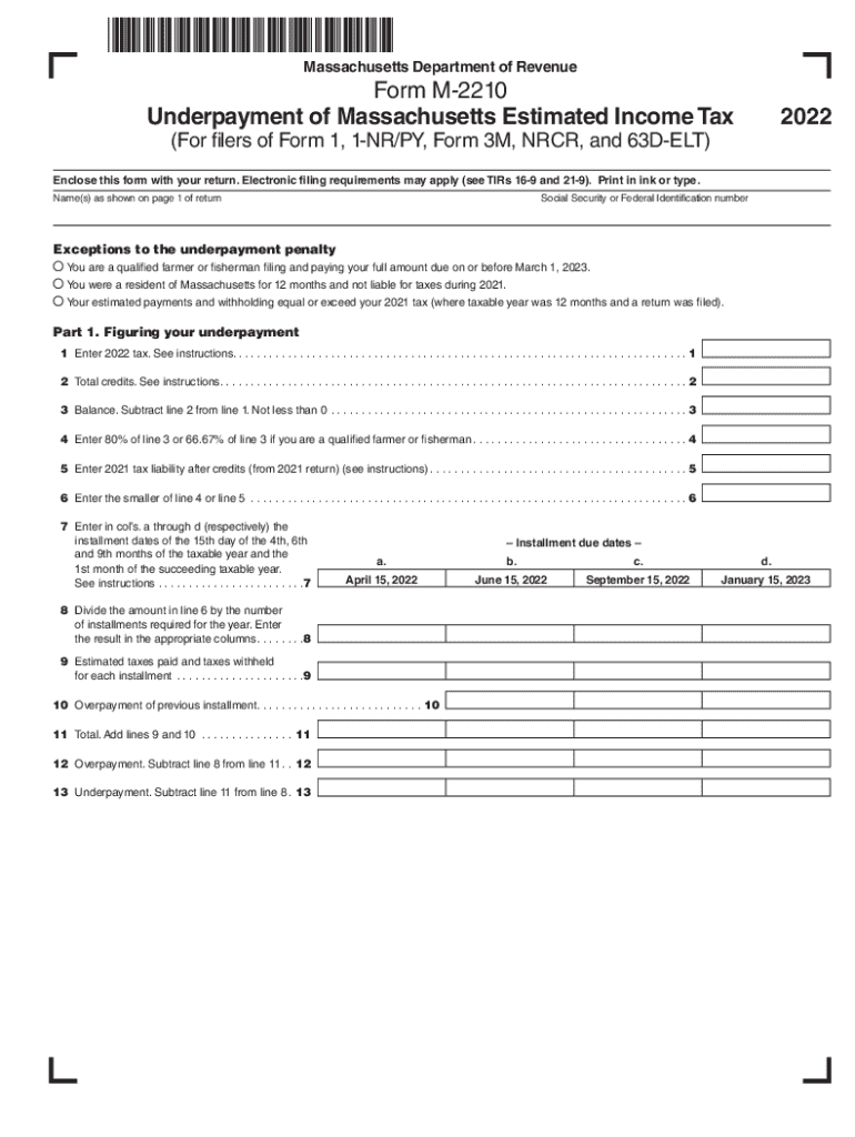 Tax filers required to submit this form include individuals and entities who did not meet their estimated tax payments. Understanding the use of the Massachusetts Form M-2210 ensures filers can navigate their obligations effectively while minimizing financial repercussions.