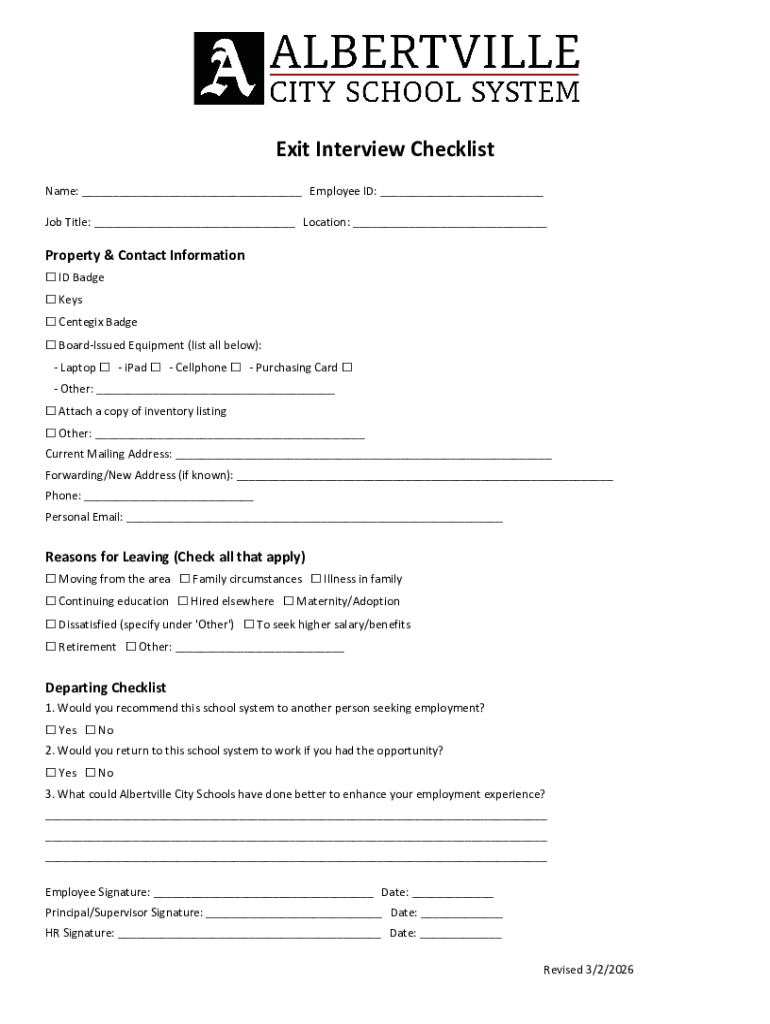 The Exit Interview Checklist is an employment form used by Albertville City Schools to collect feedback from departing employees.