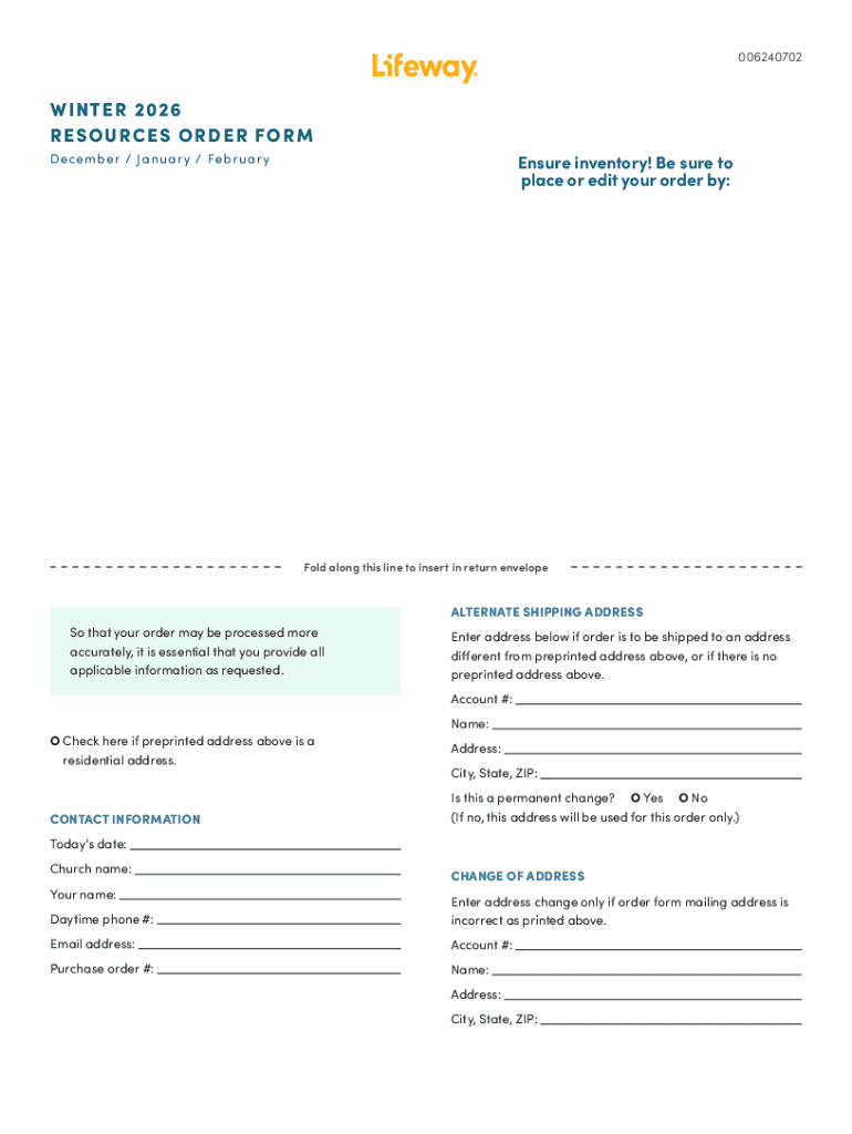 The Winter 2026 Resources Order Form serves as an essential tool for churches and organizations to facilitate the ordering of various resources, including magazines, devotionals, and Bible study materials. This form is crucial in helping maintain accurate inventory levels, ensuring that church operations run smoothly. By using a church order form template, organizations can streamline their ordering process and keep track of their resource needs effectively.