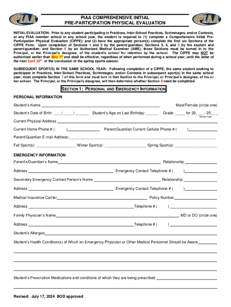 The PIAA Comprehensive Initial Pre-Participation Physical Evaluation (CIPPE) is a critical medical consent form utilized by student athletes in Pennsylvania. This form is essential for ensuring the health and safety of athletes participating in interscholastic athletics.