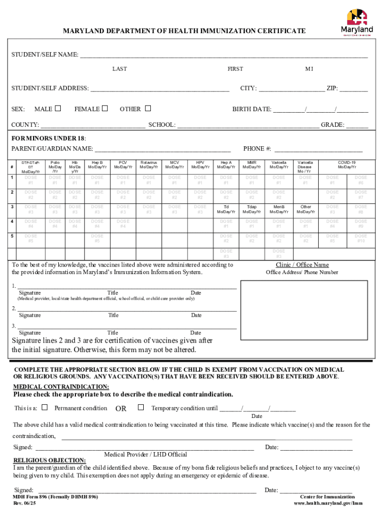 The Maryland Immunization Certificate is a healthcare form used by students and their guardians to document vaccination history for school enrollment in Maryland.
