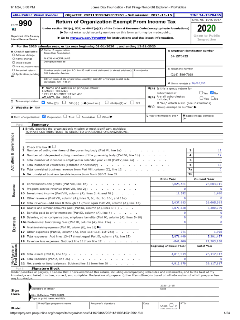 IRS Form 990 is essential for tax-exempt organizations, serving as a cornerstone in nonprofit financial reporting. This document plays a vital role in ensuring that accurate financial disclosures are sent to the IRS. Specifically for the year 2020, the form is pertinent to the Jones Day Foundation.