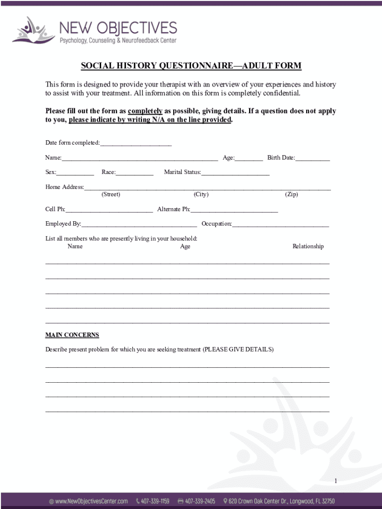 While there may not be a strict deadline for submitting the Adult Social History Questionnaire, it is advisable to complete it before your first therapy session to provide your therapist with essential background information.