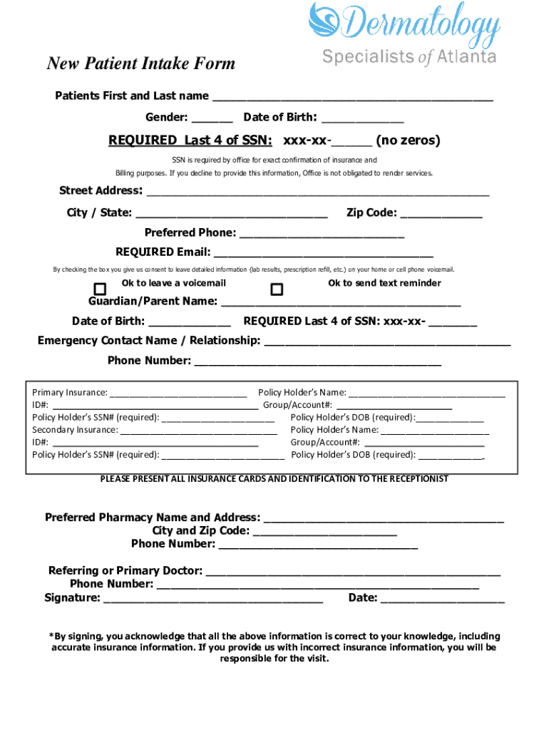 To complete the New Patient Intake Form, you will need your personal identification details, insurance information, and relevant medical history. Ensure you have your insurance card and any past medical records handy to provide accurate information.