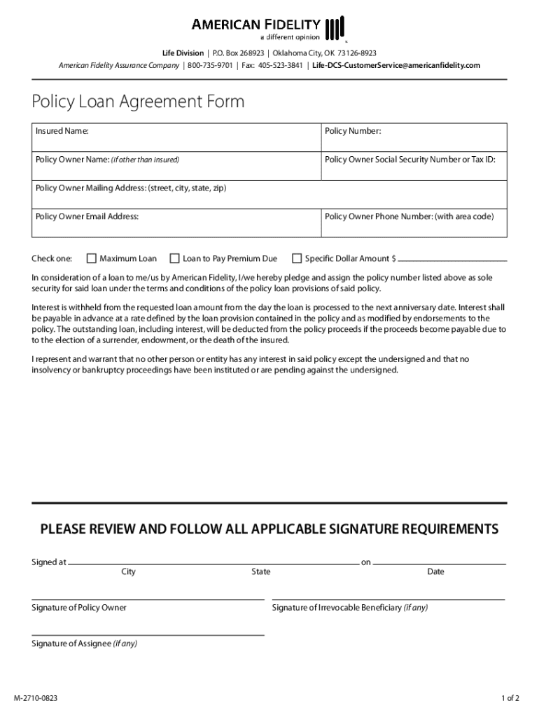 Life Division | P.O. Box 268923 | Oklahoma City, OK 731268923 American Fidelity Assurance Company | 8007359701 | Fax: 4055233841 | LifeDCSCustomerService@americanfidelity.comPolicy Loan Agreement