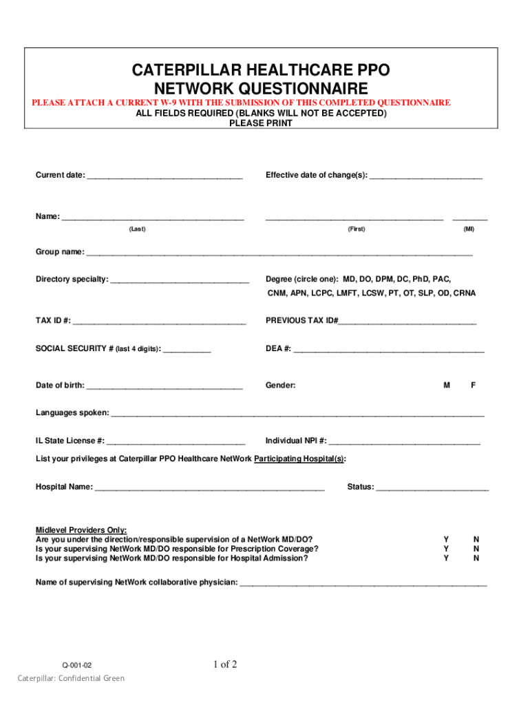 The Caterpillar Healthcare PPO Network Questionnaire serves to update healthcare provider information within the Caterpillar PPO Healthcare Network. This essential form aims to maintain accurate and current data for improved healthcare access and directory listings. A current W-9 form submission is crucial, ensuring compliance and facilitating timely updates of provider details. The questionnaire is instrumental for providers engaging with the Caterpillar network.