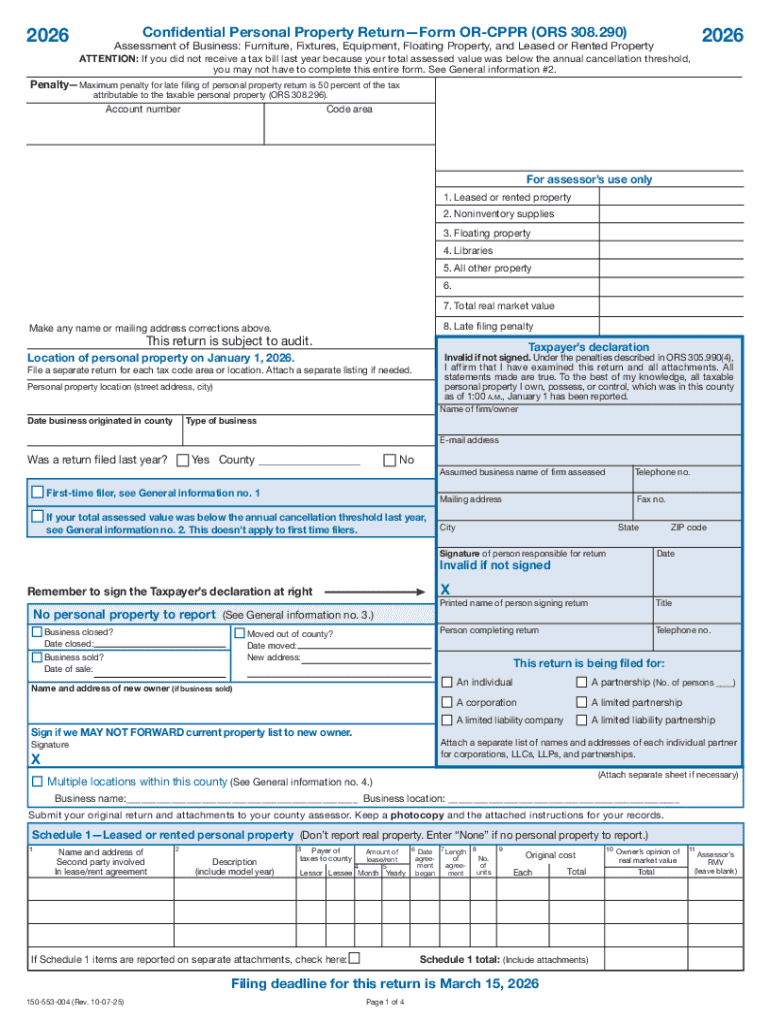The Oregon Confidential Personal Property Return (Form OR-CPPR) is a crucial tax document specifically designed for reporting personal property owned, possessed, or controlled by businesses in Oregon. This form is essential for fulfilling the legal requirement placed on business owners to report their property for tax purposes.