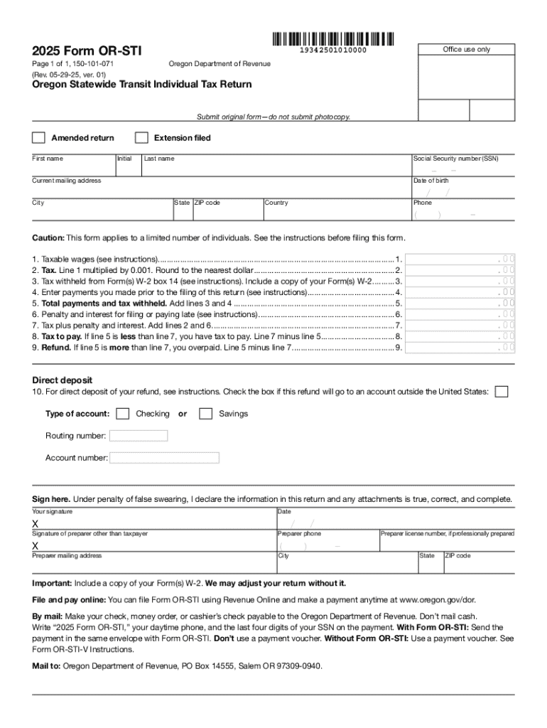 The Oregon Statewide Transit Individual Tax Return, also known as Form OR-STI, is a crucial document for taxpayers in Oregon. This form serves the primary purpose of reporting and paying state transit taxes, which contribute significantly to local transportation projects. It is essential for individuals to understand the importance of accurately completing this form, as it requires signatures from both the taxpayer and preparer to validate the submission.