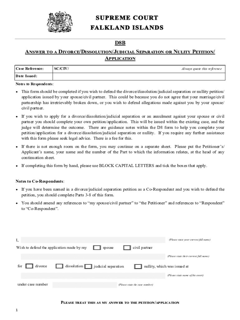 The Divorce/Dissolution/Judicial Separation Answer Form is a legal document used by respondents to defend against a divorce or separation petition filed by their spouse or civil partner in the UK.