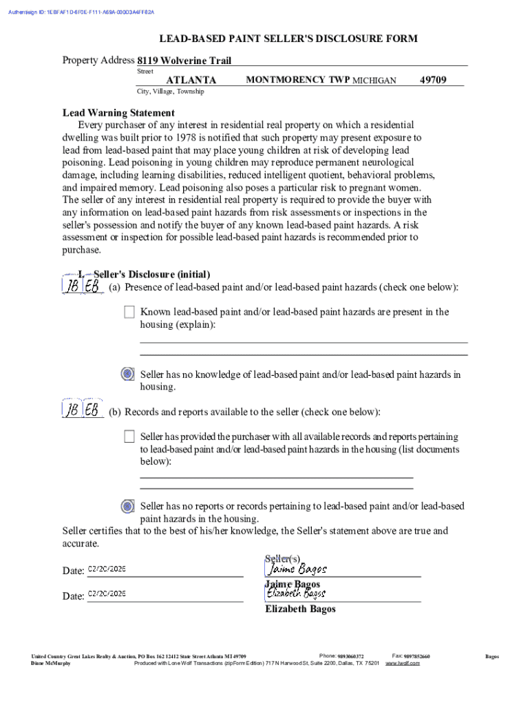Sample Completed Michigan Lead-Based Paint Seller's Disclosure Form