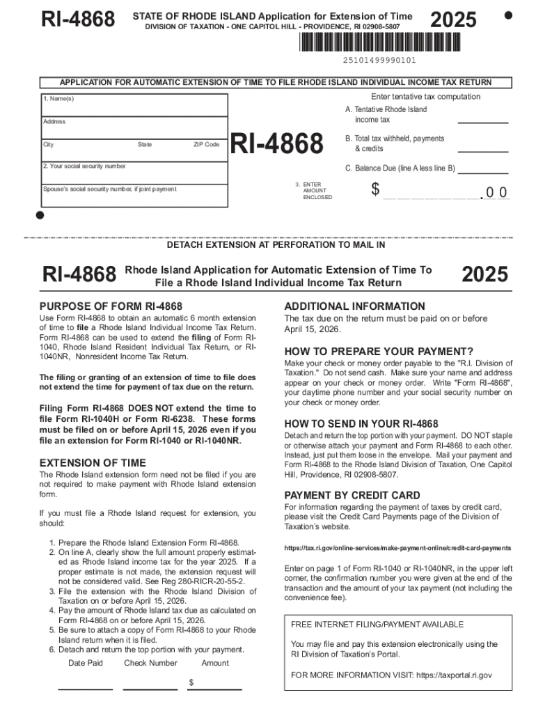 There is generally no fee to file the RI-4868 extension form itself. However, ensure that any taxes owed are paid by the deadline to avoid interest and penalties.