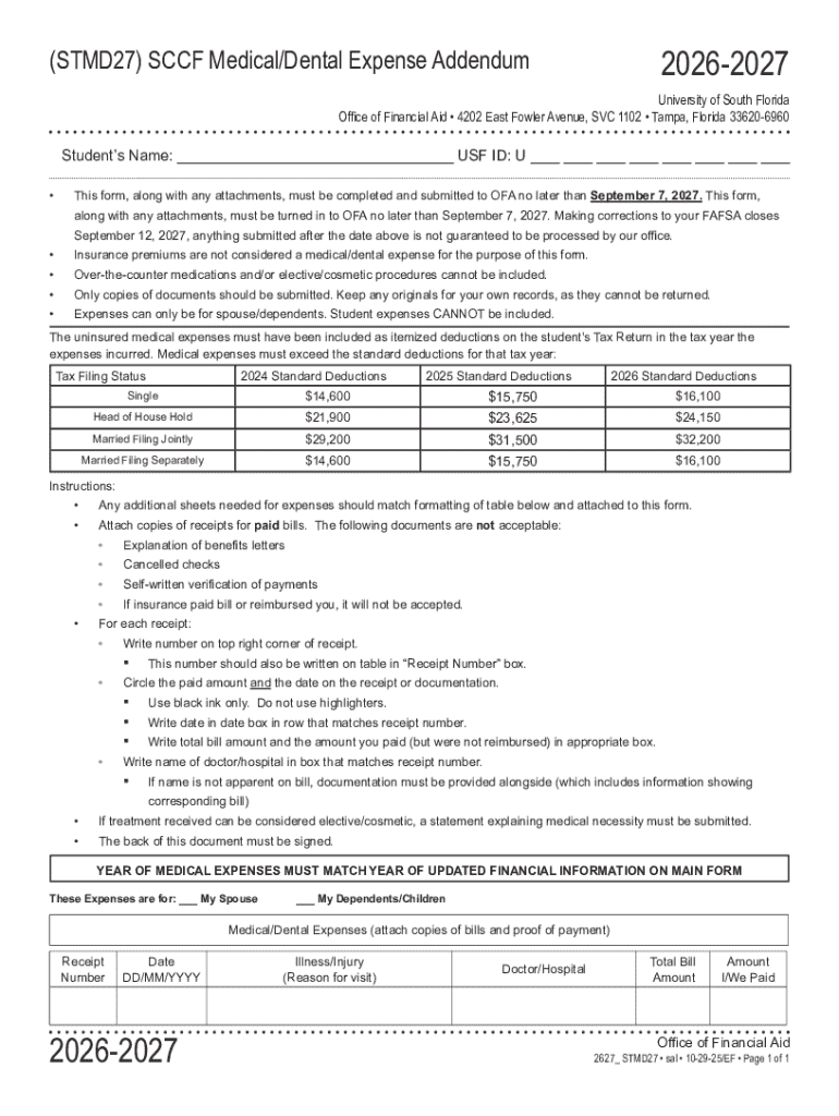 The USF SCCF Medical/Dental Expense Addendum must be submitted by the specific financial aid deadline set by the University of South Florida each academic year.